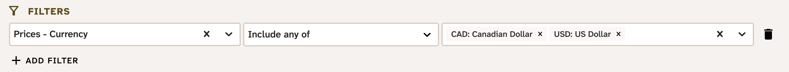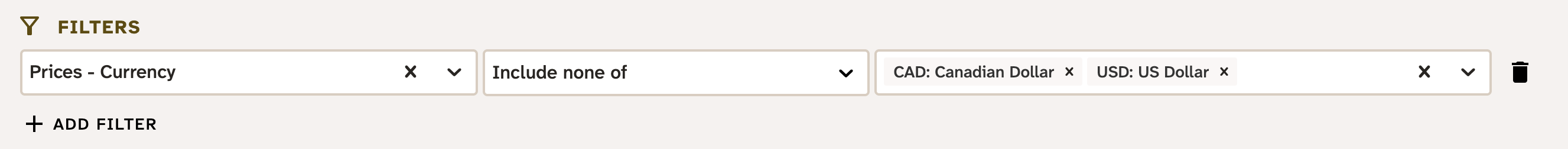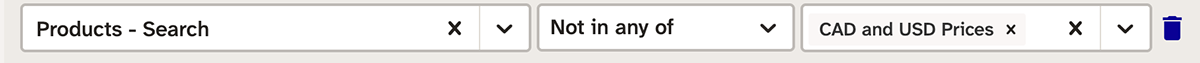 Suppose a search is needed that includes only products that have a Canadian dollar price or a US dollar price. This needs a filter on price currency code: