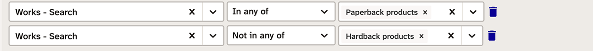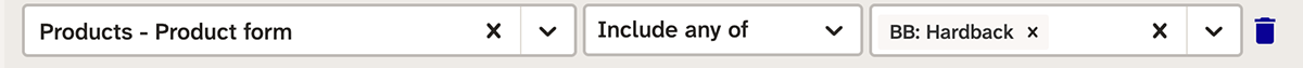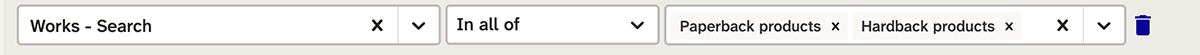 As a simple example, a search for forthcoming hardback or paperback products needs two filters: one for the product’s publishing status (forthcoming), and one for the product’s form (hardback or paperback).